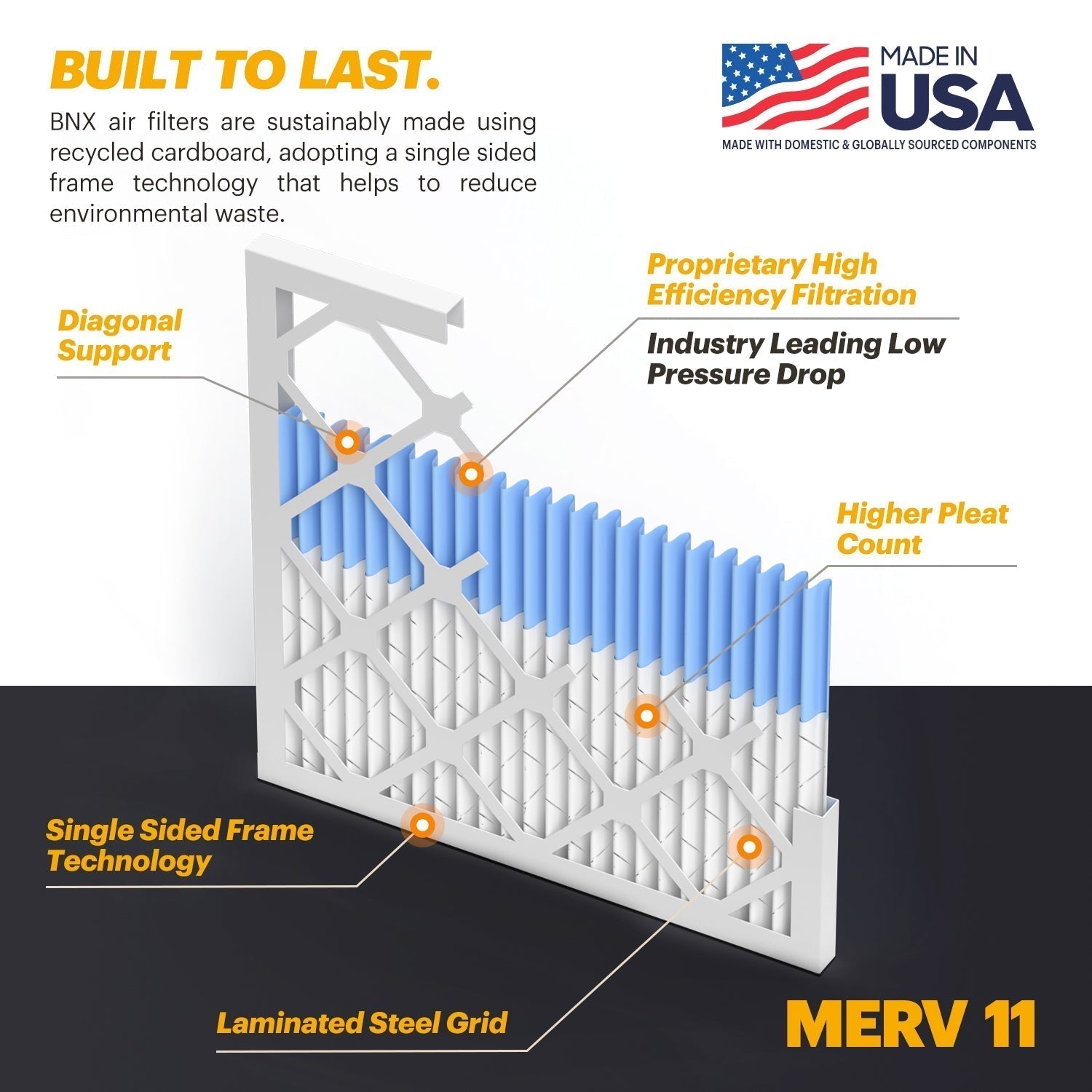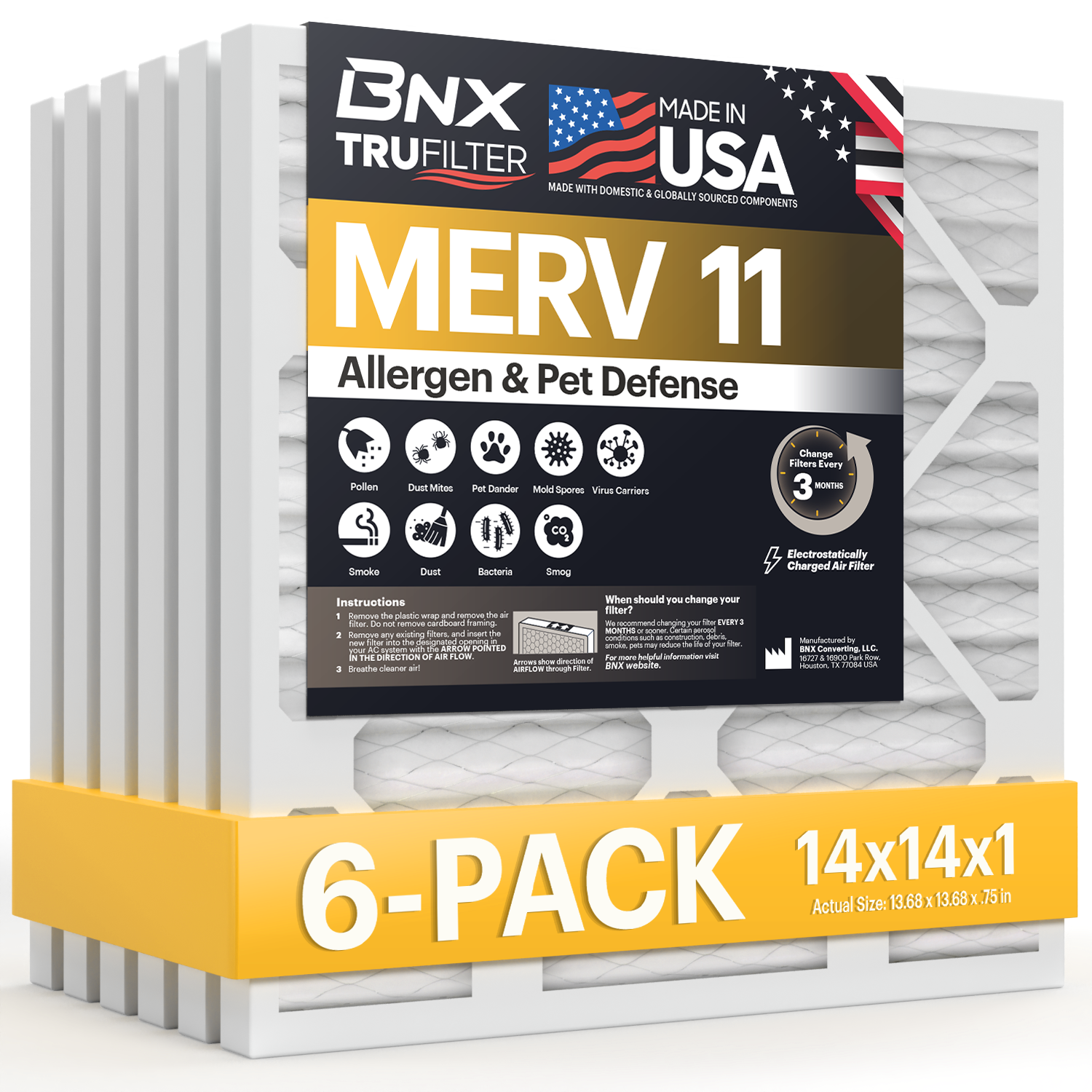 BNX TruFilter 14x14x1 MERV 11 Pleated Air Filter – Made in USA (6-Pack)