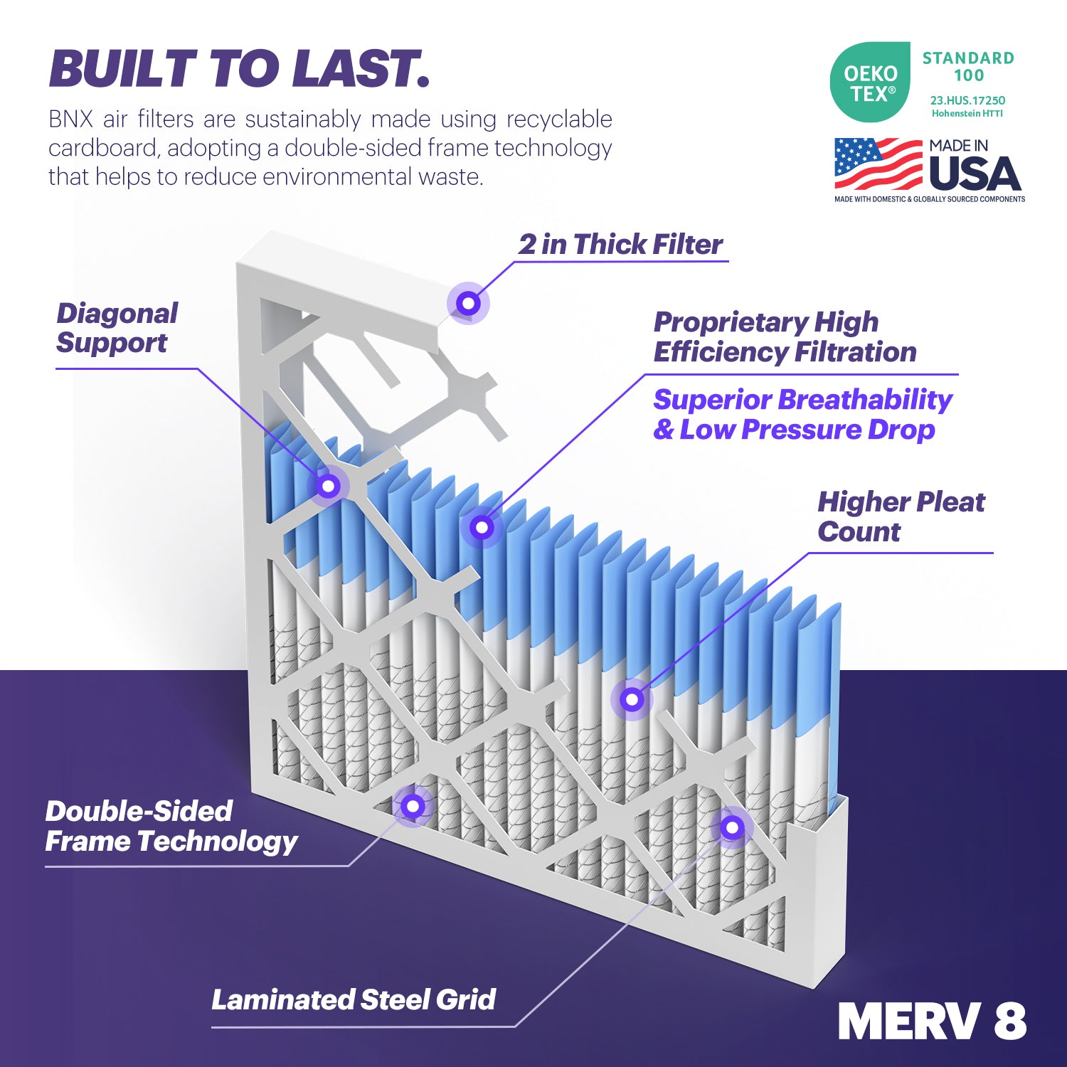The BNX MERV 8 100% synthetic electrostatically charged air filter media outperforms standard fiberglass filters and adopts the latest in electrostatic filtration technology to allow for industry leading superior low air flow resistance while maintaining the highest grade level of filtration.