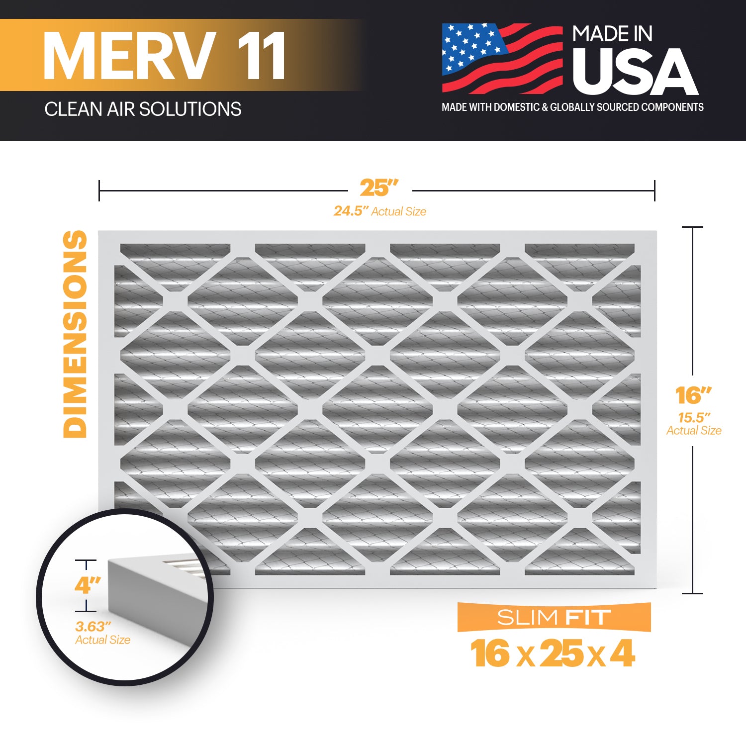 BNX TruFilter 16x25x4 MERV 11 Pleated Air Filter – Made in USA (2-Pack) (Slim Fit)