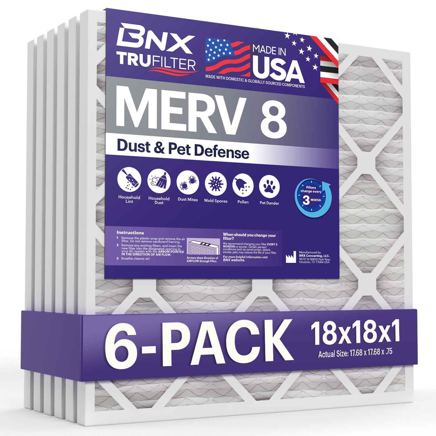 BNX TruFilter 18x18x1 MERV 8 Pleated Air Filter – Made in USA (6-Pack)