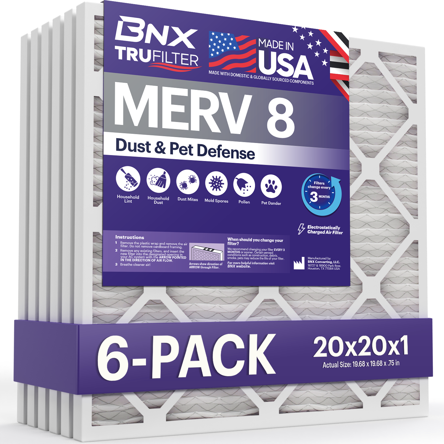 BNX TruFilter 20x20x1 MERV 8 Pleated Air Filter – Made in USA (6-Pack)